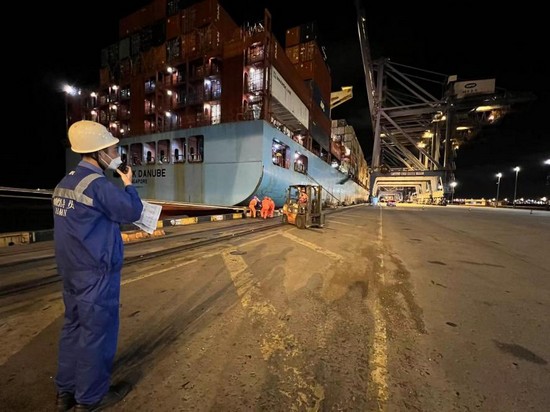 近期,“新漳州”轮靠泊振东分公司,船上搭载的第五届进博会海运全展品箱顺利完成接卸。公司 时间规范“进博箱”操作流程,从船舶计划到生产装卸采取专人保障,提前做好装卸生产设备的安全检查,在31箱区设置“进博箱”专门堆放场地,配备24小时视频监控,安排专人值守,确保进博展品物资在装卸、堆存等各环节管控到位。接卸转运过程中,现场管理人员做好作业指挥及车辆引导,党工团突击队员冲锋在前担重任,稳妥完成了“进博箱”装卸和设备运行保障工作。后续,振东将持续保障“进博会”物资接卸绿色通道顺畅,以优质高效专业服务为新一届进博会顺利召开贡献力量。
