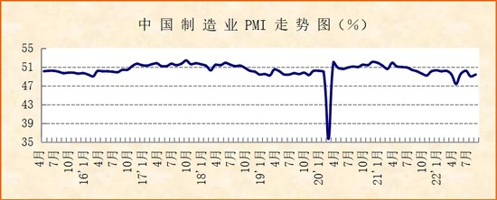 中国物流与采购联合会、 统计局服务业调查中心发布的2022年8月份中国制造业采购经理指数(PMI)为49.4%,较上月上升0.4个百分点,经济运行呈缓中趋稳势头。分项指数变化显示,企业生产活动持稳运行,原材料和产成品价格继续下降,消费品制造业持续较快增长。当前经济面临的主要问题是恢复基础不牢固,市场需求持续不足,中小企业压力较大。