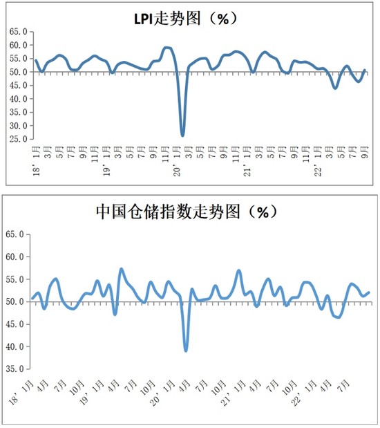 中国物流与采购联合会发布的2022年9月份中国物流业景气指数为50.6%,较上月回升4.3个百分点;中国仓储指数为52%,较上月回升0.8个百分点。
