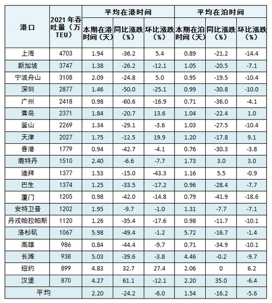 欧美各主要港口拥堵未有明显缓解,船舶平均在港时间增减不一。其中,美东主要港口纽约港船舶平均在港时间为4.83天,环比增长27.4%;欧洲汉堡港船舶平均在港时间为4.27天,环比减少12.1%。